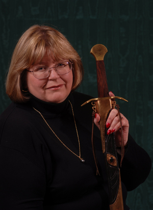 *It is a custom-made pattern-welded sword made of meteoric iron which my husband commissioned for me as a Valentine's Day present in 2003; the custom scabbard includes black star diopside stones (a sort of four-pointed star sapphire) and some lovely leather and bronze work.